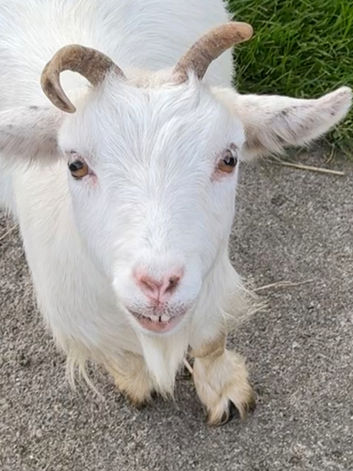 Charlie — our friendly pygmy goat. Curious and playful, Charlie loves being brushed and will happily pose for photos.